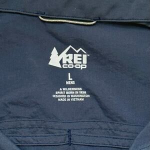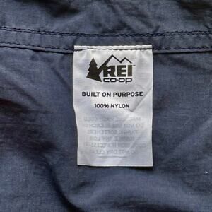Versatile REI Co-op long-sleeve shirt in dark blue, made from 100% lightweight polyester. Water-resistant and perfect for fall weather, hiking, or casual wear. Snap button front with two chest pockets. Excellent pre-owned condition.