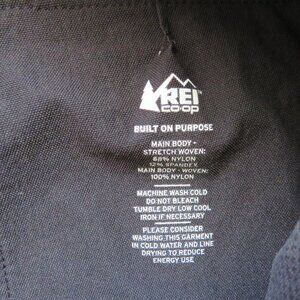 REI Co-op Women's Screeline hiking pants. Size 8 petite, regular fit. Color is black. 88% nylon, 12% spandex. Moisture-wicking, quick-dry and water-resistant fabric. Stretch fabric allows for freedom of movement. UPF 50+ sun protection. Zipper and two-snap closure, belt loops, three front pockets and two rear pockets. Inner waistband has an elastic cord for adjusting the waist. Reinforced knees. The pants have snaps in the lower legs so you can roll up and secure the cuffs.