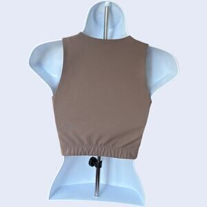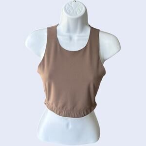 Minimalist cropped active tank in brown with a scoop neckline, high back, and an elastic hem for a secure fit. Smooth, stretchy jersey feel—great for workouts or everyday athleisure. Solid neutral tone pairs with anything. Condition: Good. Measurements in photos.