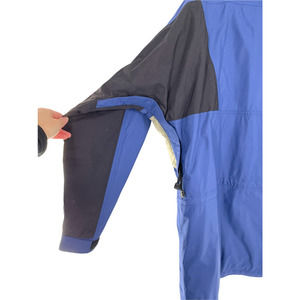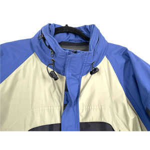 Classic rain jacket. Elements waterproof and breathable fabric, mesh-lined, attached adjustable hood. Hem and waist drawstring, velcro cuffs, pit zips, one interior, two chests, and two front handwarmer pockets.