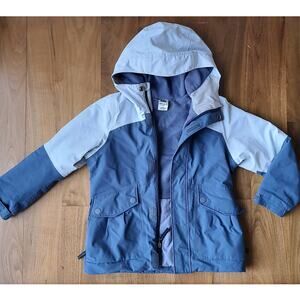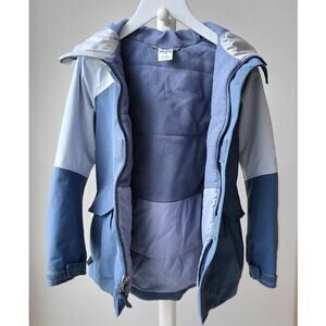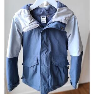 REI Co-op Timber Mountain Girls ski winter fleece-lined insulated jacket with hood. Waterproof, windproof, insulated, perfect for snow mountain play. Stylish two-toned blue/gray color. A beautiful jacket!