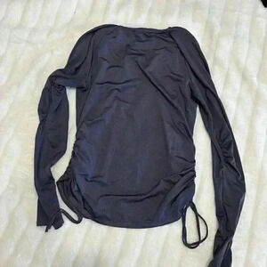 Stylish long sleeve swim coverup. Features side ruching and tie details. Perfect for beach or poolside.