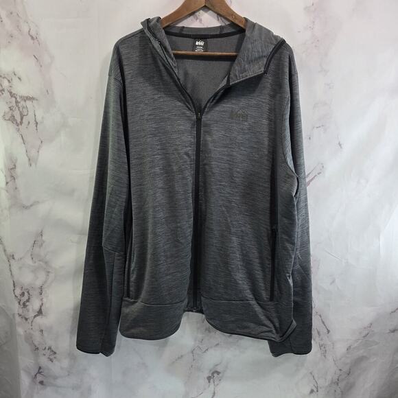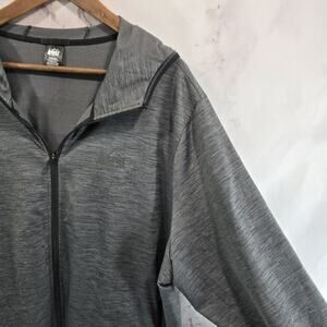 REI Jacket Mens XXL Gray Hooded Full Zip Lightweight Stretch Running Knit Jersey