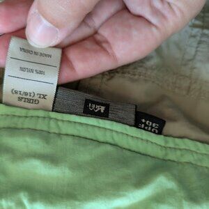 Comfortable and durable kids' casual bottoms. Features a khaki base with green accents. Zip-off legs, perfect for outdoor adventures. Girls 16-18
