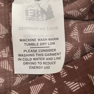 REI long sleeve button down shirt. Brown with a geometric pattern. Size Large. In very good preowned condition. No stains or holes. 2 front chest pockets. Armpit to pit measures approximately 22 inches. Hi Lo Top of shoulder down front is 27 inches. Down back 29 inches. Comes from a smoke free home.