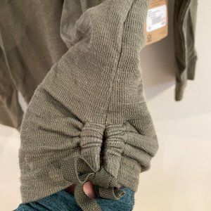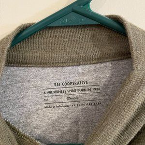 Army green long sleeve shirt. Inside material is very soft tshirt material while the outside is a thicker material. The sides have drawstrings. Extra Small.