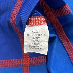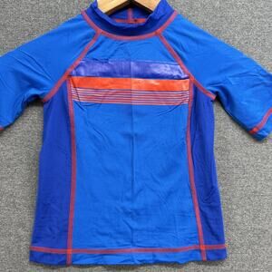 This REI Rash Guard Shirt for boys, size XXS (4-5 years), features a bold blue design with red striped detailing on the chest. Ideal for surfing, swimming, or any water activities, this rash guard offers UV protection and comfort for your little one. Perfect for keeping them safe from the sun while looking stylish at the beach or pool.