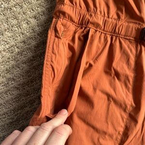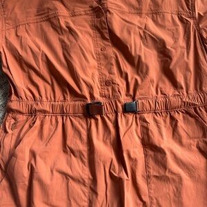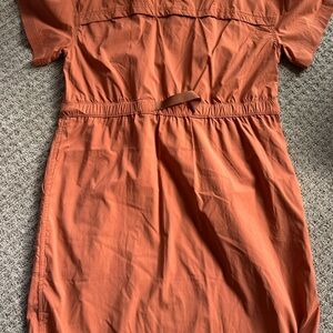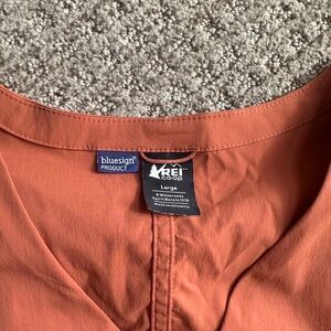 Rust-colored button-up top. Features a classic collar and smooth fabric.