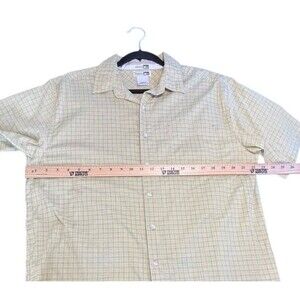 The product is a men's medium yellow short sleeve button-down shirt by REI. It features a classic collared neckline with a button closure, perfect for casual occasions. Made of woven cotton fabric, this shirt is suitable for all seasons and has a regular fit. The shirt's plaid pattern adds a touch of outdoor style, making it ideal for a day at the beach or other outdoor activities. Easy to care for, this machine washable shirt is a versatile and stylish addition to any man's wardrobe.