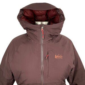 2-layer waterproof, breathable nylon shell with fully sealed seams provides burly weather protection850-fill-power goose down is highly compressible and provides abundant warmth for its light weightDown has also been treated with a durable water repellent (DWR) to help it resist waterInsulation is mapped to the body, providing warmth where it's needed and reduced bulk where it's notBonded baffles welded to the shell eliminate cold spotsInsulated 3-way hood adds protection and warmthPit zips and 2-way front zipper act as vents to dump core heat as neededSeam-free shoulders won't chafe under pack strapsAdjustable cuffs seal out the elementsZippered chest and hand pockets securely stow essentialsREI is Climate Neutral Certified; as we work to actively reduce our footprint, we measure annual carbon emissions and purchase an equivalent amount of verified carbon creditsMade in a Fair Trade Certified™ factory
