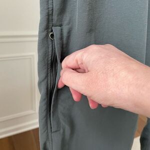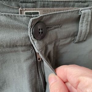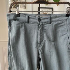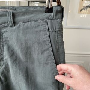 REI outfitters, men’s nylon cotton and spandex blend straight leg pants. Size 30 and the tag size says 34 inch inseam but these have been washed and the inseam measures more like 33 inches now. Lots of pockets, both hip pockets and an inseam zipper pocket with two back welt pockets. Button and zip closure. The color is a drab olive green.