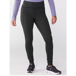 Built for trail running, the women's REI Co-op Swiftland thermal running tights offer range of motion for changing terrain and compression pockets that hold essentials but won't hinder your stride.