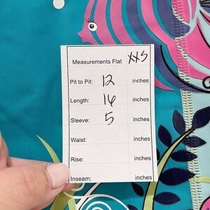 Gently worn condition. Turquoise and teal blue short sleeve with Angle Fish. Size and measurement are in photos. Ships fast, same or next business day.