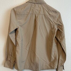 This REI button down shirt in a versatile tan color is crafted from lightweight cotton, offering a comfortable fit for everyday wear. Its classic design and collared neckline make it a timeless addition to any wardrobe.