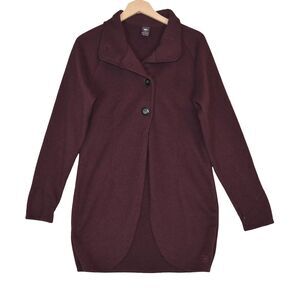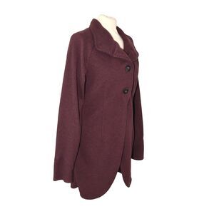 This REI womens jacket combines everyday wearability with the brands practical outdoor sensibility. Designed in a deep burgundy shade with a soft, textured feel, it features a button front closure, wide lapel collar, and a longer cut that offers versatile layering potential. Perfect for transitional seasons, it works well styled casually or as a polished outer layer for cool-weather outings. Size Large.