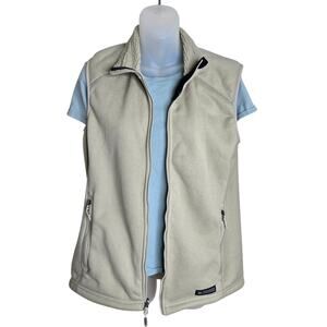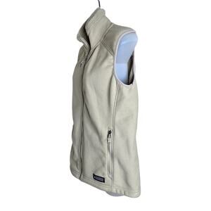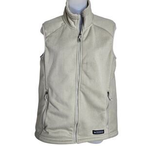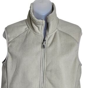 The beige winter vest features a full zipper, fleece lining and ribbed accents.