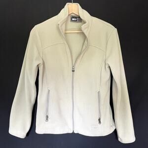 This REI cream full zip fleece sweater jacket is perfect for layering or wearing on its own.
