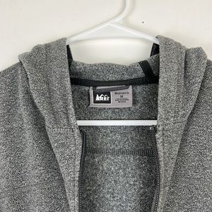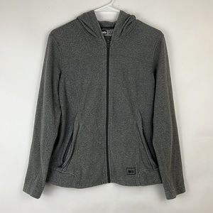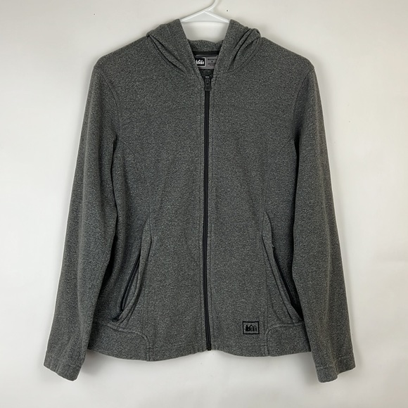 REI gray fleece zip up hoodie jacket with two front zip-close pockets. Wash in cold; tumble dry low. Approximate Measurements (laying flat): bust: 19” length: 23” pit to cuff: 18”