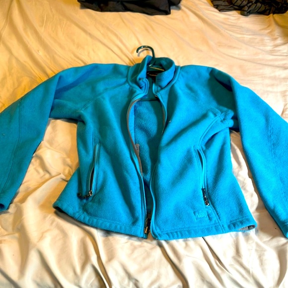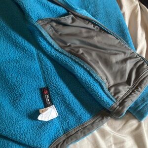 Blue REI jacket. Has two pockets on the outside with zippers. Two pockets on the inside as well. Soft and insulated inside. Size S