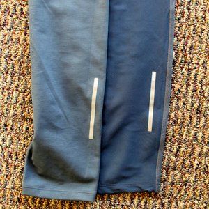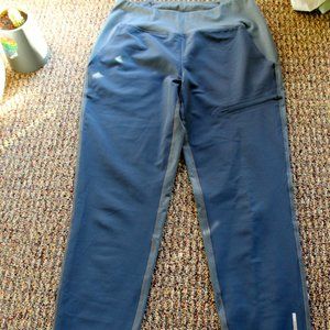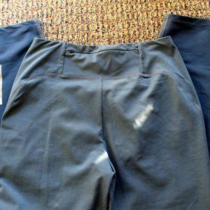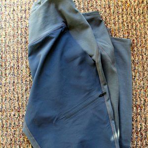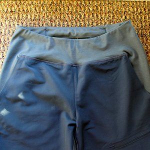 Front of leggings have tech soft-shell material while the back is stretchy.