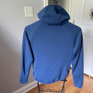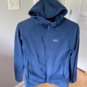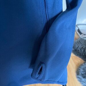 Lightweight and comfortable navy blue jacket with pockets and hood. Perfect for layering. In great condition.