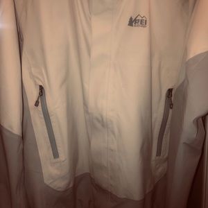 REI NWOT Light/dark grey rain coat. Zip up closure, two hand pockets.