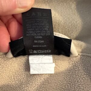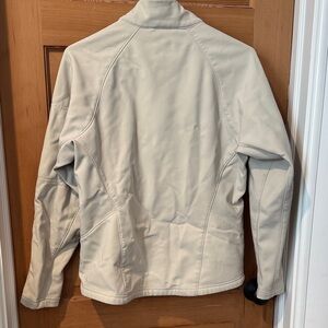 Women’s cream/stone, soft shell jacket. Medium. Zippered pockets with third pocket on the left sleeve. Stretchy. Great for in between seasons. Logo has worn off the front but otherwise no rips stains or tears.