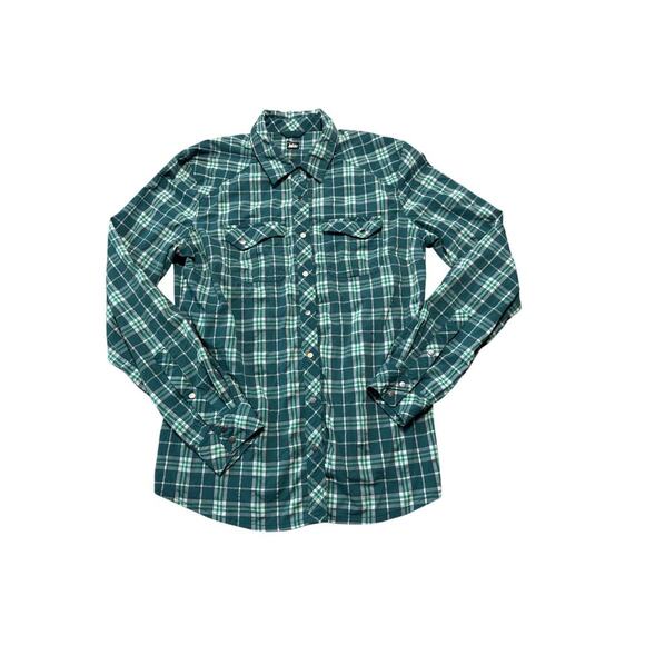 REI women’s snap up shirt, size Small. This lightweight green Plaid shirt features a slightly fitted styling, perfect for your next outdoor adventure!
