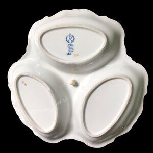 Vintage RARE Reichenbach Echt Kobalt fine porcelain 3- section dish designed in an ornate Rococo Revival style with elaborate gilding along the rim and ridges and a raised central handle for easy carrying. The ornamental flourishes around the cobalt panels with delicate floral cartouches framed in white and highlighted with golden scrollwork reflect a luxurious, aristocratic aesthetic, fine craftsmanship and decorative elegance. Excellent condition About 10 Inch measured across. VINTAGE RARE COLLECTIBLE