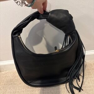 REIKE NEN Women's Black Leather Tasseled Knot Detail Handle Strap Handbag Purse