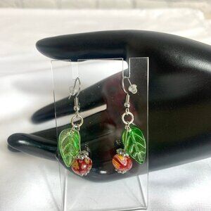 Reimagined drop dangle cherry earrings featuring glass beads and hook closures. The earrings are 2 inches long.