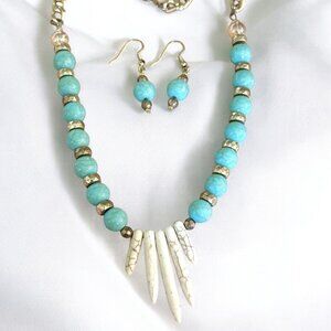 REIMAGINED Handmade green chalcedony and magnesite bead necklace and earrings set. Artisan jewelry by Reimagined featuring genuine green chalcedony beads paired with natural magnesite spikes for a bold bohemian look.