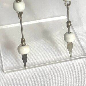 FEATURES: Each dangle drop earring features 3 vintage milk glass beads on a stainless-steel wire fashioned into coils and an arrowhead on new stainless-steel hooks. These earrings are a reimagined creation from broken vintage jewelry, promoting repurposing, recycling, reusing. See photos for more details.