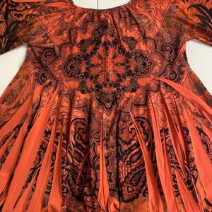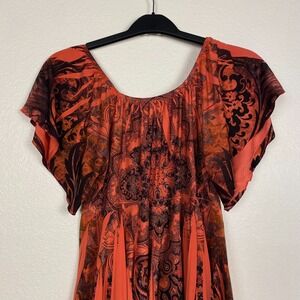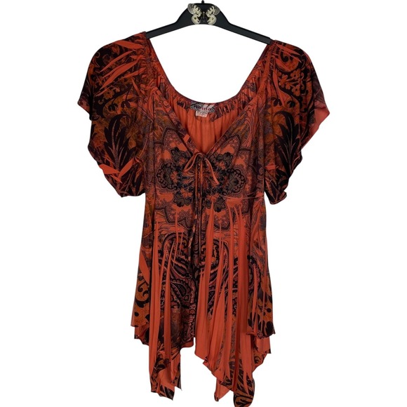 REINA Vintage Y2K Floral Top Womens Sublimation Flare Sleeve Heart Neck Size 1 Black Orange