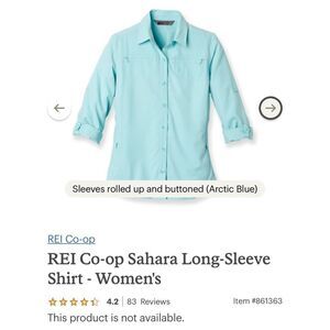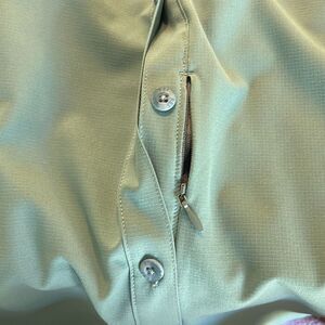 Great REI hiking shirt. Roll up cuff sleeves if you prefer to wear short sleeve or roll down for long. Two zippered front pockets, as well as a hidden zippered pocket by button flap for keys. Also has little tab to hang your sunglasses or glasses on vented back in very good condition. Also have a kaki one and another listing. Pit measures 21 inches. Also has two zippered side pockets.