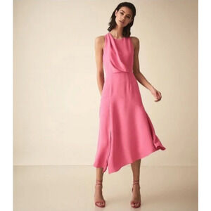 Add a touch of elegance to your wardrobe with this beautiful REISS Cheyenne Back-Cutout Midi Dress. The dress features a stunning colorblock pattern in pink and white, with a round neckline and sleeveless design that makes it perfect for any formal occasion. The pleated accents and bow tie add a touch of femininity to the dress, making it a perfect fit for women of all sizes. This dress is made of 100% polyester and is available in size 2. It is recommended to hand wash only to maintain the quality of the dress. The dress is perfect for winter, summer, fall, and spring and can be worn for various occasions such as weddings, holy communion, parties, and cocktail events. Get ready to make a statement with this colorful dress that is sure to turn heads.