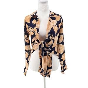 REISS Floral Tie Waist Blouse Navy Gold Large Print Size 2 EUC Linen Blend