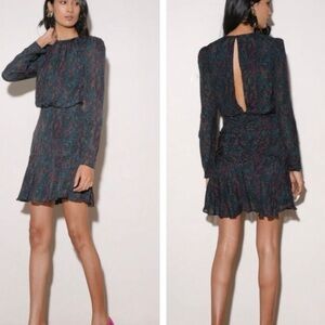 Long sleeves with Zipper cuff Blouson waist A-line silhouette with slightly ruffled hem Ruched skirt in back