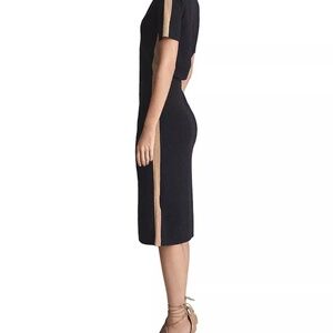 The Rosie dress in navy is a contemporary take on a classic workwear piece. Knitted to a flattering silhouette with side-stripe detailing, this piece works best when worn with a blazer and trainers for a pared-back look.