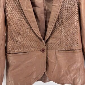 Tan leather blazer style jacket with basketweave detail, fully lined