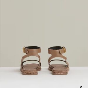 Chic tan leather sandals with slingback design. Features a stylish buckle and braided sole.
