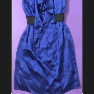 REISS brand dark blue satin dress with front loose ruffles and a black waistband. Strapless dress only worn 1 time. Knee-length in size US 2