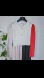 Color block red, black, white & nude satin, pleated shirt-dress, puffed sleeves, raw hem & front buttons.