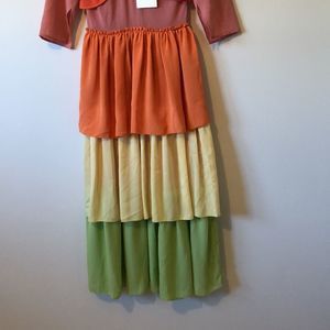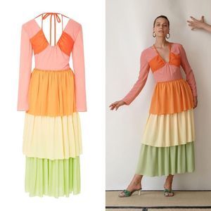 The Rejina Pyo Cleo Dress in Crepe Ombre Mix is a fitted dress with Tired skirt and halter neck detail. Rushed v- neck detail at bust and contrast stitching.