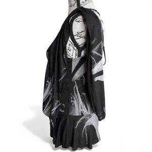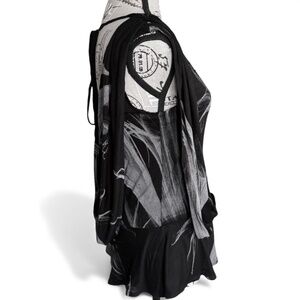 Striking and dramatic RELIGION top featuring their signature gothic-art print in black and grey with an elegant, fully draped silhouette. The front showcases a sheer V-neck inset trimmed with intricate black glass beads, giving it a subtle shimmer. The fabric drapes in soft folds both in the front and the back, creating a fluid, sculptural shape that moves beautifully. The back has a deep cowl with a tie at the neck for adjustment.