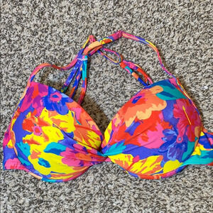 Embrace the summer vibes with this RELLECIGA bikini top, showcasing a striking abstract floral color palette. The classic triangle design with thin straps ensures a comfortable fit, while the vibrant pattern adds a touch of energy to your beach look. Size large. Padded. Excellent condition.
