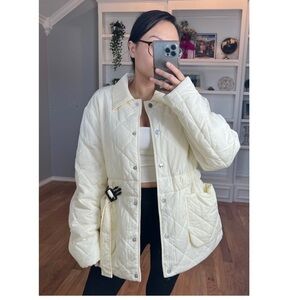 Take on colder days in modern style in this quilted jacket detailed with roomy pockets that keep your hands warm and a buckle belt that cinches the waist.
