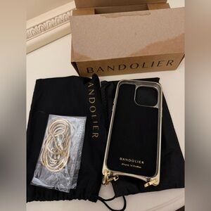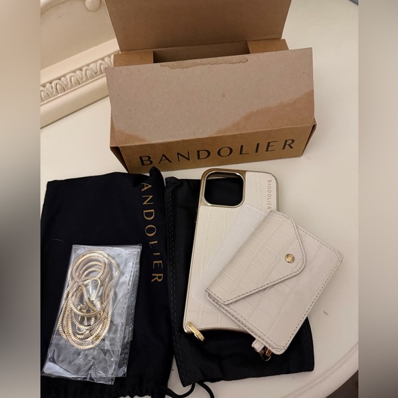 Elegant phone case with cream pouch. Gold trim and strap for hands-free use in excellent condition.