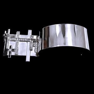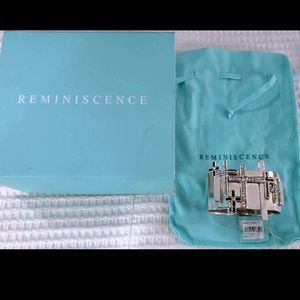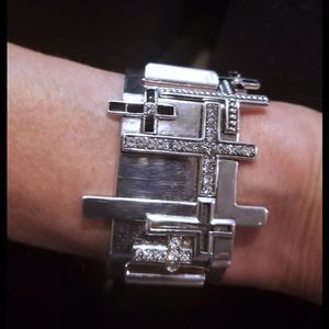 • Hand Made in France, One-of-A-Kind by Reminiscence Paris silver-tone metal-plated brass bangle features a medley of cross motifs some embellished with rhinestones and a hinge clasp, luxuriously lightweight bling for your wrist.