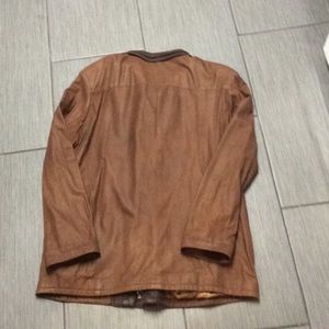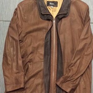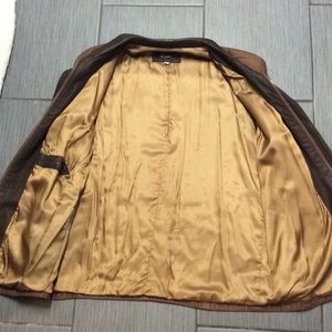 REMY...WOMENS BROWN WITH DARKER BROWN LEATHER JACKET...100% AUTHENTIC LEATHER...ZIP CLOSURE WITH ONE BUTTON ON TOP AND ONE ON BOTTOM...THIN SHOULDER PADS...POCKET ON EACH SIDE OF JACKET...INNER POCKET AS WELL...SIZE:L...WORN ONE SEASON...NO RIPS/NO STAINS/NO SCRATCHES